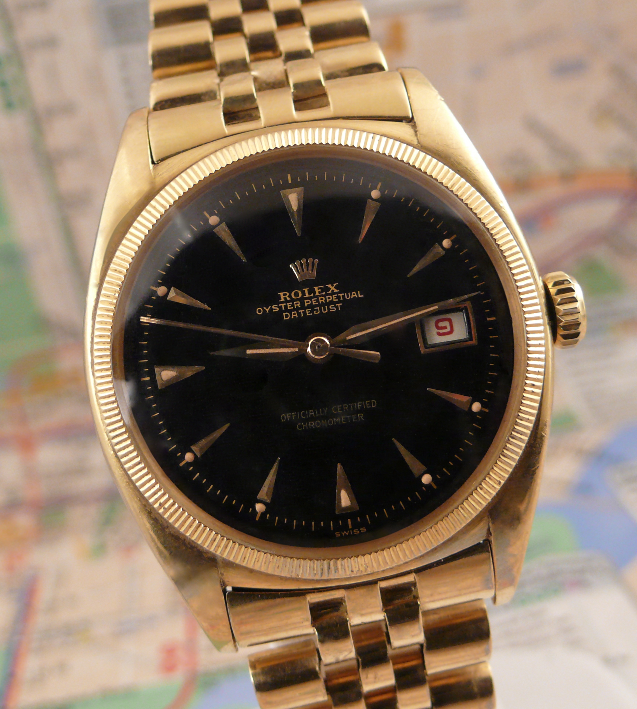Original black gilt dial has aged beautifully. This early style dial with half Rolex crown and DateJust written in stunning copper gilt is only found on early ovettone reference 6105. The dial has aged evenly and remains glossy. The luminous are all fully intact and match the original hands perfectly.