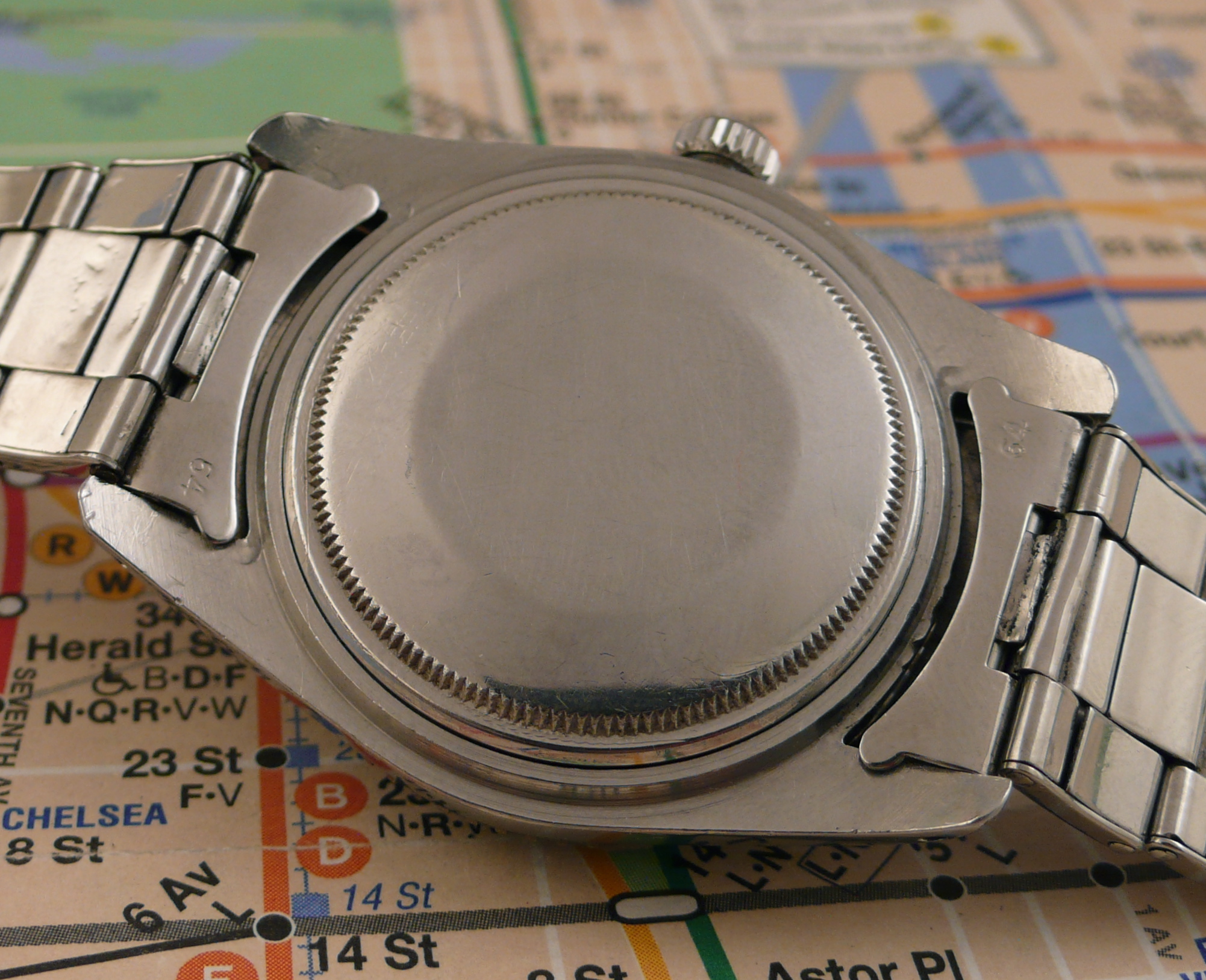 Original swiss made riveted bracelet with 64 endpieces dated 1957 is in excellent condition with minimal stretch.