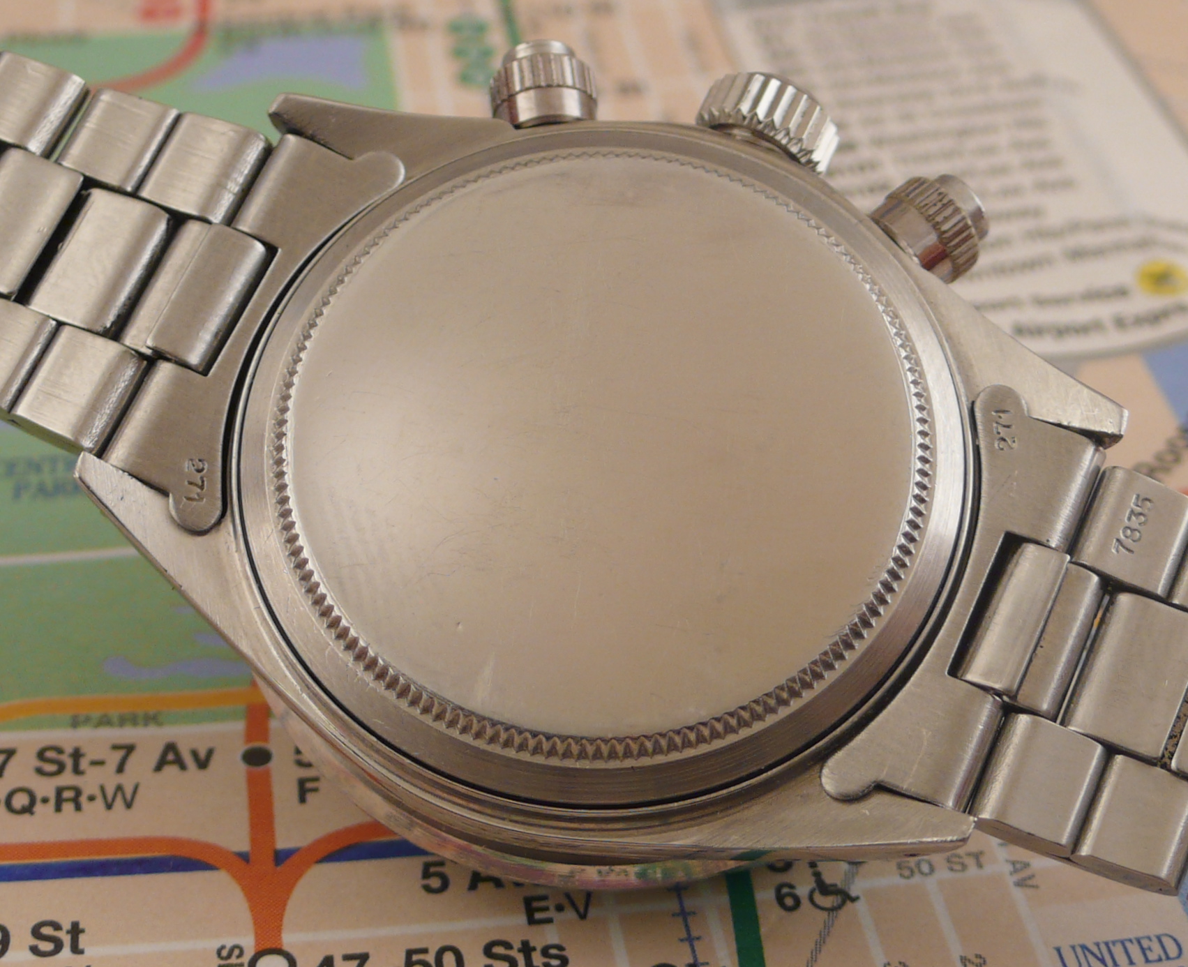 The original case has been polished in the past, but remains sharp and even in size. The bezel is original MK1. The pushers are original as well and are the rare MK0 with flat sides. The top pusher is showing a bit of brassing. Original glass and twin-lock crown as well.